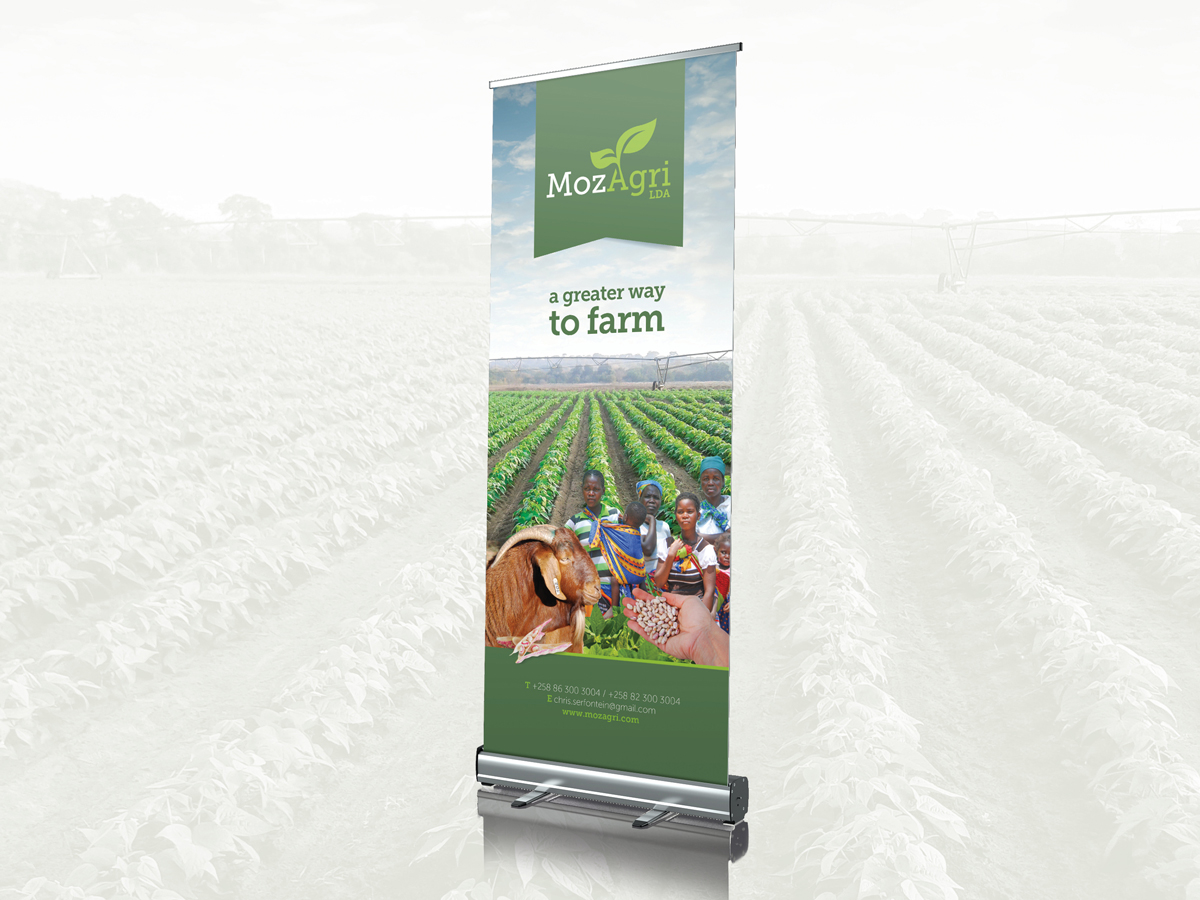 Corporate Identity update and collateral material for MozAgri Farms. The project consisted of refreshing their brand look and applying to various print and digital material, including the development of a CMS website and mascot development for their satellite distribution outlets throughout the country.